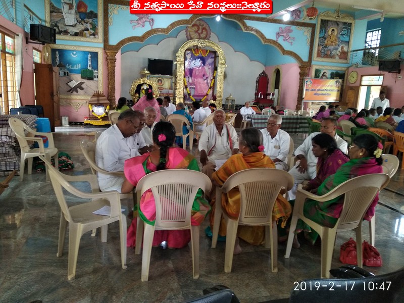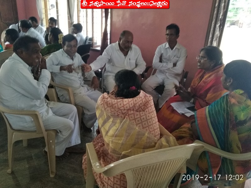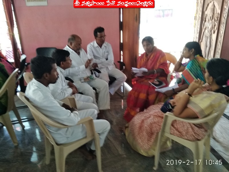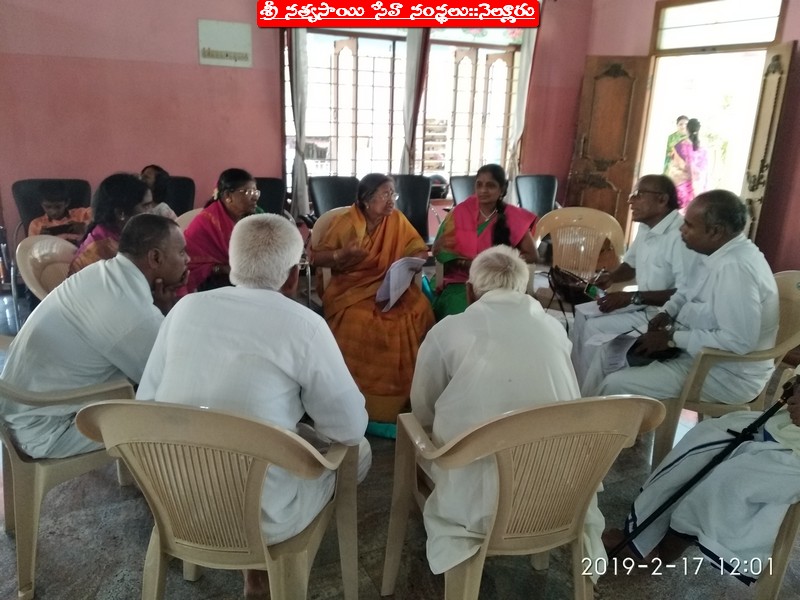 With the Divine Grace of our Beloved Bhagwan, the District Review meeting of SSSSO, Nellore was conducted on 17/2/2019 (Sunday) at Sri Sathya Sai Bhajan Mandir, Ramurthy Nagar, Nellore. Our State President & other State coordinators have reviewed individually all the Samithis and their affiliated Bhajan Mandalis by forming into groups. The group discussion went on enthusiastically. It was just like a workshop, wherein all the in-charges of Samithis and Bhajan Mandalis were given the opportunity to inform the programmes going on in their respective Samithi/Bhajan Mandali. They were allowed to express their views and suggestions. In fact, the discussions were lively and everyone participated in his respective group and expressed his happiness on the satisfactory review of the Agenda items. The Review meeting has inspired the participants and motivated all of them to go forward with dedication to carry out the programmes in their Samithi/Bhajan Mandali with Duty and Devotion. The Review Meeting commenced at 10:00 am and concluded at 4:30pm