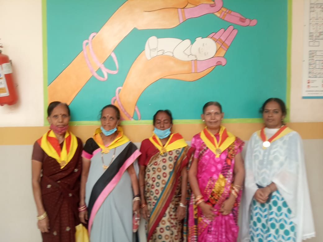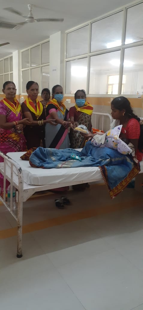 with the divine blessings of our Sai maa, on 19th January 2023 as part of Mahila day, the mahila of Chittoor samithi, Chittoor district , after offering prayers to Lord Ganesh in the Main building distributed the kits that consisted a new dress, a fruit, a biscuit packet, a vibuthi packet and swami's photo for the mothers of 52 newly born babies in the Maternity ward of the government hospital chittoor